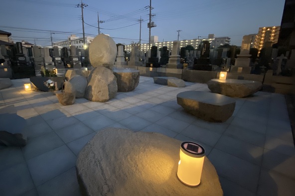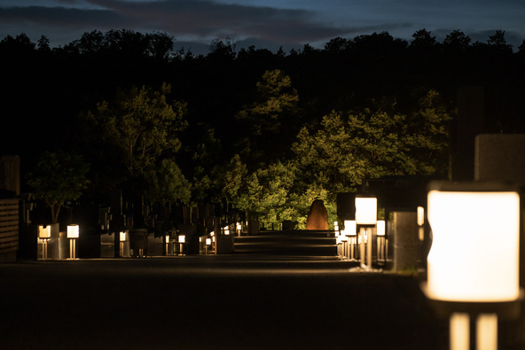 證大寺では、夜間でも安心してお参りできるよう、やさしく包み込むようなソーラーランタンの照明を設置しています。従来の夜のお墓のイメージとは一線を画し、足元が明るく照らされているため、安心して参加できます。