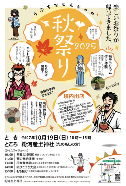 和歌山県紀の川市の「粉河産土神社」(こかわうぶすなじんじゃ)では、2025年10月19日(日)に、「粉河産土神社の秋祭り2025」が開催されます。