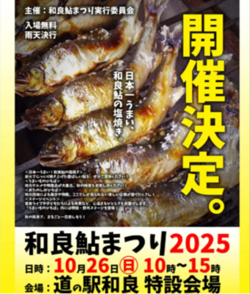 岐阜県郡上市の「道の駅和良(和良運動公園)特設会場」では、2025年10月26日(日)に日本一の鮎の塩焼きが味わえる「和良鮎まつり」が開催されます。