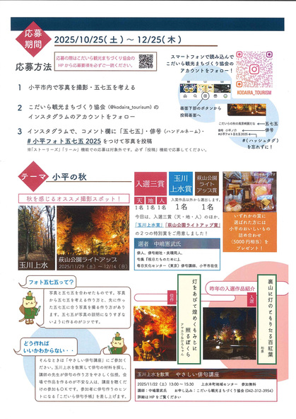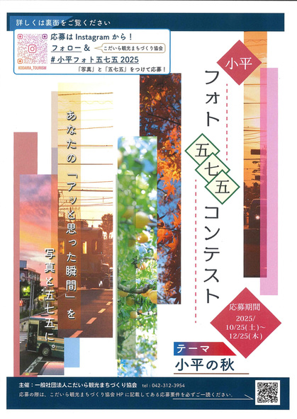 小平市では「小平フォト五七五コンテスト」が10月25日(土)~12月25日(木)まで開催されます。今年で3回目となるこのコンテストは、「小平の秋」をテーマに、写真と五七五の俳句を組み合わせて表現する創作イベントです。