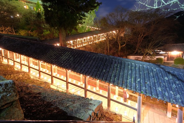 仁王門から本堂まで続く登廊や礼堂(らいどう)に、人々の願いを燈した燈明や燈籠が並べられます。この行事は、燈明や万燈籠を観音様にお供えし、願いを祈願する意味があります。