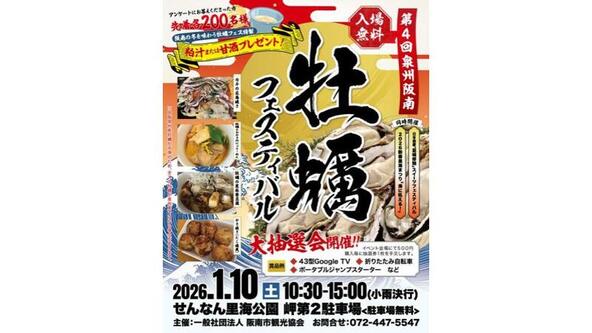 大阪府阪南市の「せんなん里海公園岬第2駐車場」では、2026年1月10日(土)に、「第4回泉州阪南牡蠣フェスティバル」が開催されます。