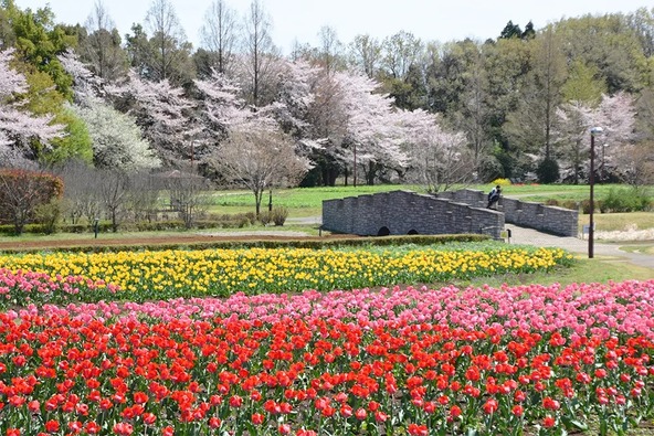 エリアごとに異なるデザインの花壇があり、同時期に見頃を迎える桜やネモフィラとの競演を楽しめ、歩くたびに新しい色彩の驚きと出会えるスポットです。