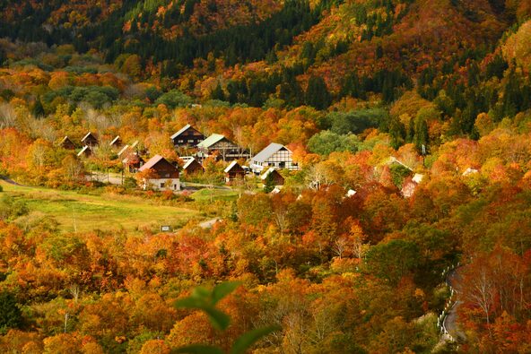 越後駒ケ岳・荒沢岳の麓にある絶景の秘境スポット。黄金色のブナの紅葉が美しい2,000m級の山々に囲まれたログハウス群は、まるで外国の森に迷い込んだよう。