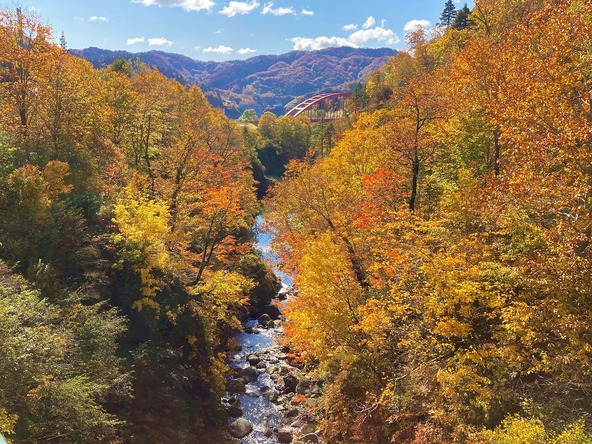 福島県境の山間地にある、知る人ぞ知る紅葉の穴場スポットです。自然のままのブナの森やカエデの木がたくさんあって、秋になると川沿いが赤や黄色に染まります。