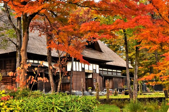 1797年に5年の歳月をかけて建てられた国の重要文化財です。かやぶき屋根の立派な建物と紅葉の組み合わせが風情たっぷり。お庭の紅葉を建物の中から眺めることもでき、ゆったりとした時間を過ごせます。