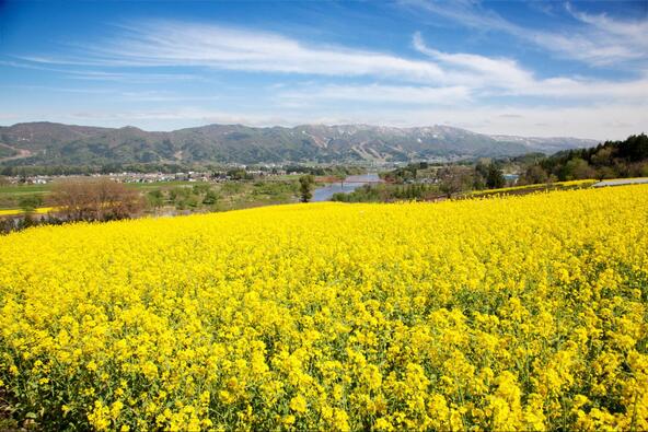 菜の花公園・北竜湖・千曲川河川敷など、飯山市内には菜の花を楽しめる場所が点在しています。花の季節には、一面に広がる黄色の景色と白く雪をまとった山並み、青い空が重なり合う風景が広がります。