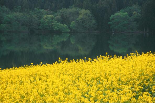 四季折々の景色が楽しめる北竜湖では、5月上旬〜中旬になると湖のほとりに菜の花が咲きます。