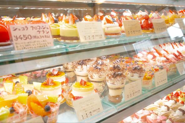 地元で長く愛されている人気のパティスリーです。ショーケースには季節のフルーツをたっぷり使った華やかなケーキやタルトが並びます。