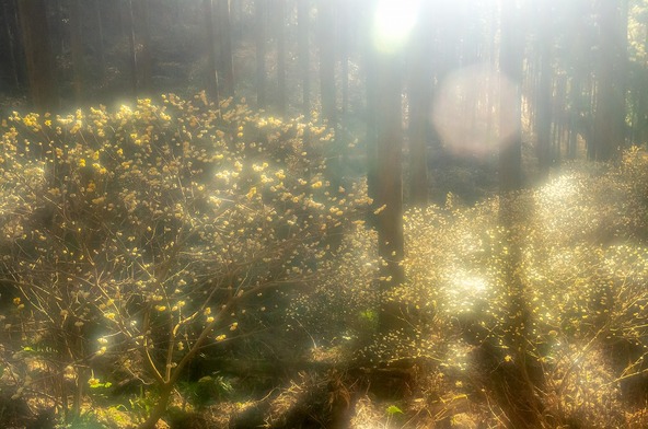 約0.7ヘクタールの杉林の斜面におよそ7,500本のミツマタが育ち、甘い香りに包まれた空間が広がります。山間部に突然現れるミツマタの景色は幻想的で、「妖精の森」とも呼ばれています。