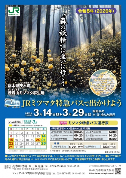 栃木県茂木町(もてぎまち)にある「焼森山ミツマタ群生地」へ、2026年3月14日(土)から3月29日(日)までの期間中の土・日・祝日のみ、JRミツマタ特急バスが運行されます。