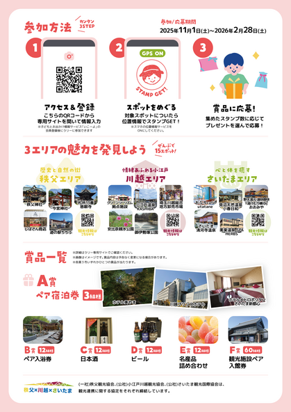 秩父市、川越市、さいたま市の3つの観光協会による観光連携協定に基づく観光連携事業として実施されるデジタル形式のスタンプラリーです。スマートフォンで各市の観光スポットを巡ってスタンプを集め、集めたスタンプ数に応じて抽選で豪華賞品が当たります。
