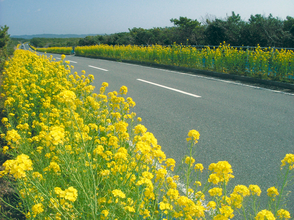 道路の左右を菜の花が彩る光景は、車やバイクでのドライブに最適です。