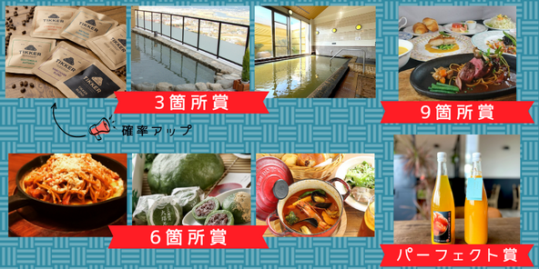 3箇所達成で地元カフェTIKKERのドリップコーヒーや海津市商品券500円分、温泉施設の無料入浴券。6箇所では海津市商品券に加えて地元グルメ店の1,000円分引換券が手に入ります。