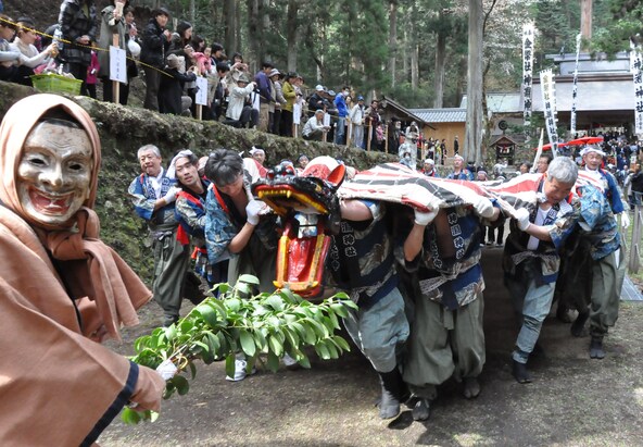 毎年4月14日に近い日曜日に行われる「神渕神社例大祭」は、須佐之男命の大蛇伝説に由来し、約420年の歴史があります。慶長8年4月14日(約400年前)に端を発し、今日まで受け継がれてきたこの祭りの見どころは、全長10メートルもある大黒獅子です。