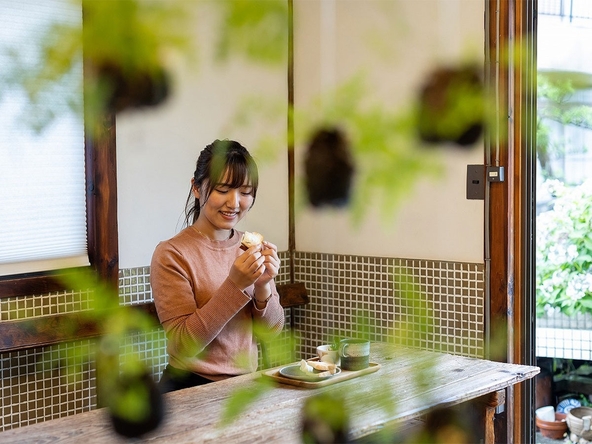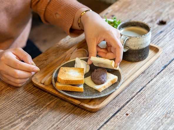 朝8時半から営業しており、こんがり焼いたトーストに草もちを挟んだ「草もちホットサンド」という驚きのモーニングメニューが話題! 自家栽培のよもぎを手摘みし、地元農家のお米を製粉、国産小豆で作ったこだわりのあんこを使った草もちは、やさしい甘さと自然のよもぎの香りが嬉しい逸品です。