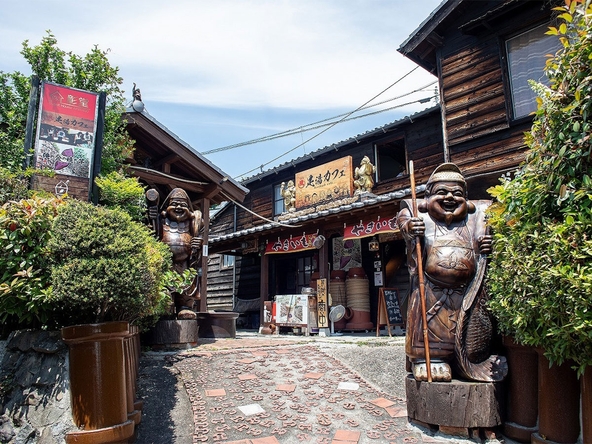 「足湯カフェ 俺の金の焼き芋」は、やきもの散歩道の中でも特にユニークな体験ができるカフェです。古民家をリノベーションした店内には、人懐っこい3匹のマイクロブタがお出迎え! 子供も「かわいい~!」と大興奮間違いなし。