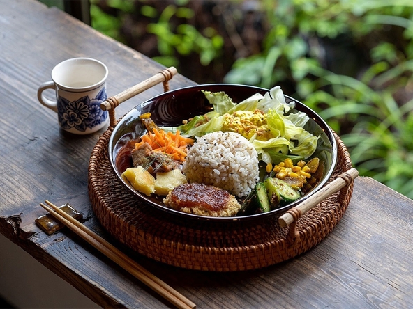 知多半島や常滑の食材、伝統の調味料を使った菜食ランチは、ヘルシーだけど心身が満たされる素朴な美味しさ。常滑焼の急須で淹れるコーヒーはまろやかな風味で、子供にはノンカフェインドリンクも用意されています。
