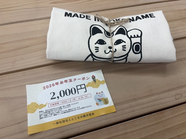 「にゃんこ福袋」は2,222円(税込)で、とこなめ観光案内所で利用できる2,000円分の買い物券と、オリジナルデザインのトートバッグがセットになっています。1月3日と4日の2日間で合計20袋の限定販売です。