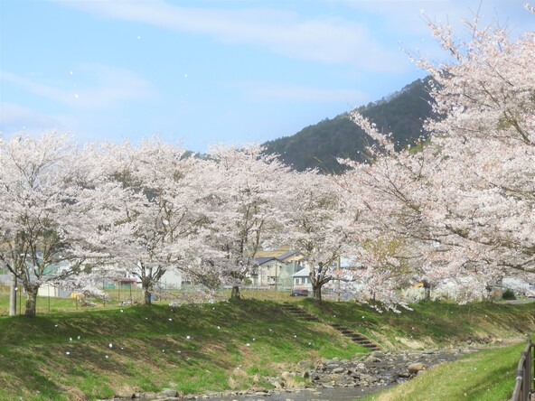 関宮ふれあいパークから歩いてすぐの水辺公園。八木川沿いに植えられた桜並木を楽しむことができます。