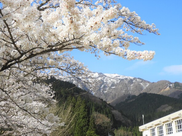 旧熊次小学校の桜。正面に氷ノ山が見え、時期があえば残雪の氷ノ山と桜を見ることができます!