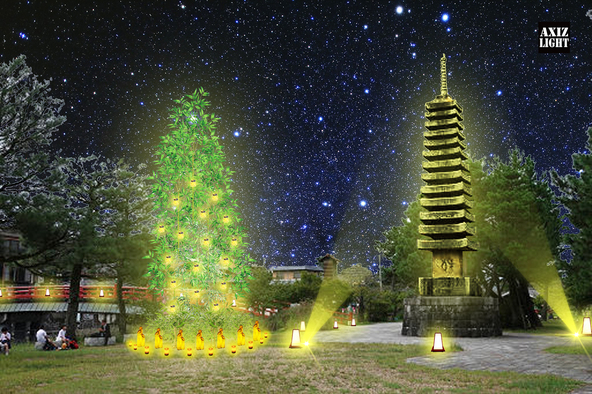 特製竹灯り、グラスランタン、キャンドルライトで彩られた巨大な笹とともに宇治公園を彩ります。