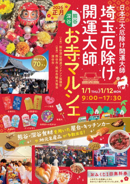 だるまを販売する露店のほか、熊谷・深谷地域の食材を用いたオリジナルメニューや地元名産品を扱う屋台やキッチンカーが登場する「お寺マルシェ」も開催されます。