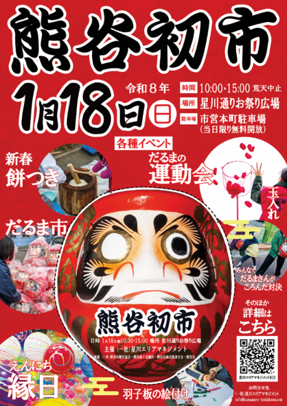 埼玉県熊谷市の星川お祭り広場で、2026年1月18日(日)に「熊谷初市(星川だるま市)」が開催されます。