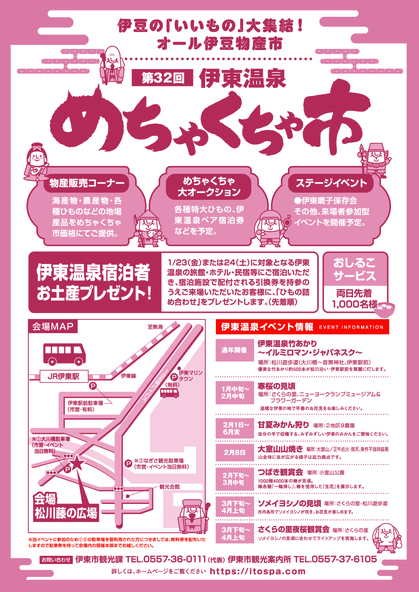 静岡県伊東市の松川藤の広場で、2026年1月24日(土)・25日(日)に「第32回伊東温泉めちゃくちゃ市」が開催されます。