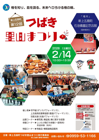 長崎県新上五島町の「石油備蓄記念会館」で、2026年2月14日(土)10:00~13:30、「第12回つばき里山まつり」が開催されます。