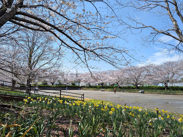さむかわ中央公園は、約70本のソメイヨシノが咲き誇る桜の名所です。満開の桜の下で過ごす時間はもちろん、公園からは富士山と大山を望むことができる絶景スポットでもあります。