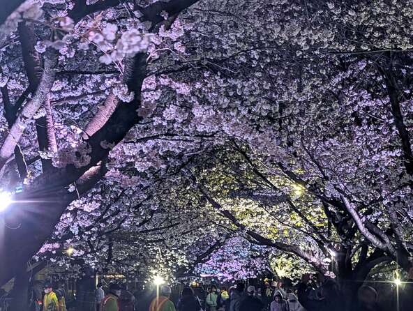 第2部は18時〜19時30分。公園の「桜のトンネル」がライトアップされ、夜空に浮かび上がる幻想的な桜の景色が広がります。昼間とはまた異なるムードの夜桜は、特別な思い出になるはずです。