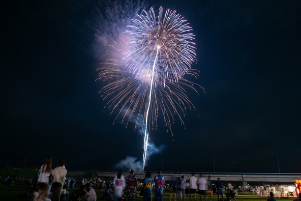 8月13日(水)の19時30分から約1時間にわたって開催される花火大会では、10号玉を含む約2200発の花火が真名川憩いの島の夜空を華やかに彩ります。