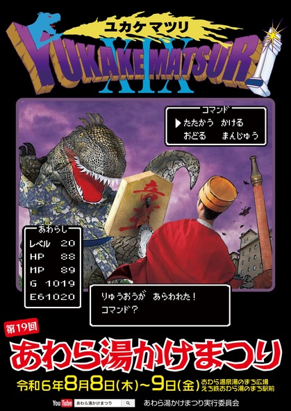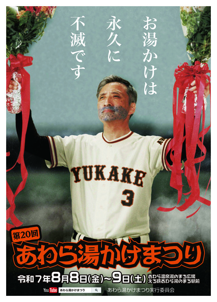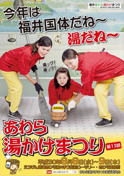 あわら湯かけまつりを主催する実行委員会では、毎年世相を反映した人物や題材のパロディでポスターやチラシを制作しており、地元でも注目されているようです。
