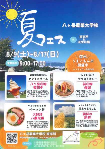 長野県原村にある「八ヶ岳農業大学校」の直売所・芝生広場で、2025年8月9日(土)から8月17日(日)まで、「夏フェス」が開催されます。