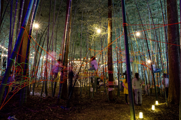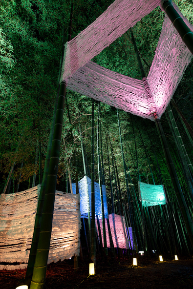 会場を歩くたびに新しい光景に出会えるような演出がされており、来場者は竹林を散策しながら竹の魅力を再発見できます。また、大正時代に建てられた格式ある豪農の館「椿寿荘(ちんじゅそう)」では、アーティストによる竹と光のインスタレーションも鑑賞できます。