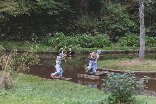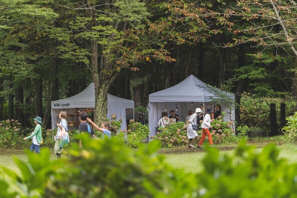 ゆるやかな芝生広場とレンガの小路、小さな水辺に大きな木立、たくさんの紫陽花に囲まれた自然豊かな会場に、全国から選りすぐりの工芸作家の手仕事作品と丁寧に作られた美味しいものの数々が並びます。