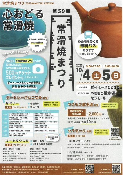 愛知県常滑市(とこなめし)にある「ボートレースとこなめ」、「やきもの散歩道会場」、「セラモール会場」の3会場で、2025年10月4日(土)、5日(日)の2日間にわたって、「常滑焼まつり」が開催されます。
