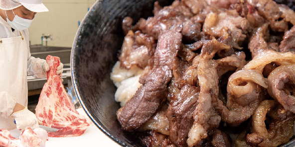 「津山名物そずり肉を自分で作ってみよう!」では、津山の方言で「削る」を意味する「そずる」から名づけられたそずり肉の調理を体験できます。肉マイスターの指導のもと、生の骨付き肉をそずって、焼いて、ご飯にのせて味わいます。
