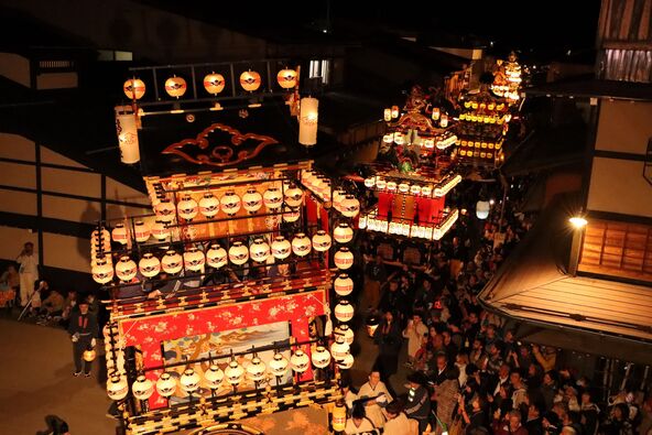 9日(木)の夕暮れからは、宵祭(よいまつり)が行われます。各屋台には約100個の提灯が灯され町を練り歩くので、幻想的な風景が広がります。