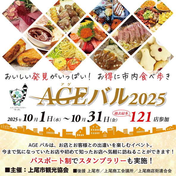 埼玉県上尾市で、2025年10月1日(水)~31日(金)まで、街バルイベント「AGEバル2025」が開催されます。