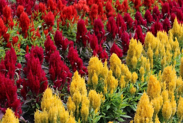 約8,000平方メートルの広大な斜面に、約1万株のコキア(別名:ホウキグサ)と同数のマリーゴールド・サルビア・ケイトウなどの園芸種が植栽されています。