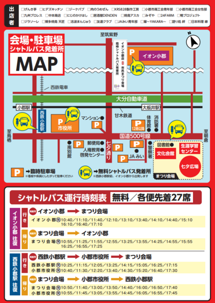 イオン小郡と西鉄小郡駅から会場への無料シャトルバスが運行されます。イオン小郡からは10:40から17:10まで、西鉄小郡駅からは10:25から17:15まで運行され、各便先着27席です。駐車場も用意されていますが、シャトルバスの利用が便利です。