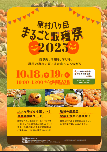 長野県諏訪郡原村の八ヶ岳農業大学校で、10月18日(土)・19日(日)10:00から15:00まで「原村八ヶ岳まるごと収穫祭2025」が開催されます。