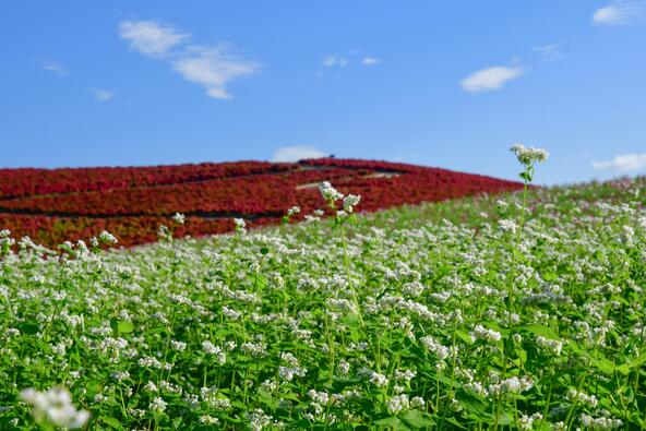 みはらしの丘は約4万本のコキアで埋めつくされており、10月上旬ごろから紅葉が始まります。緑から赤へのグラデーション、さらに赤から茶色への移り変わりなど、コキアならではの色の変化が楽しめます。