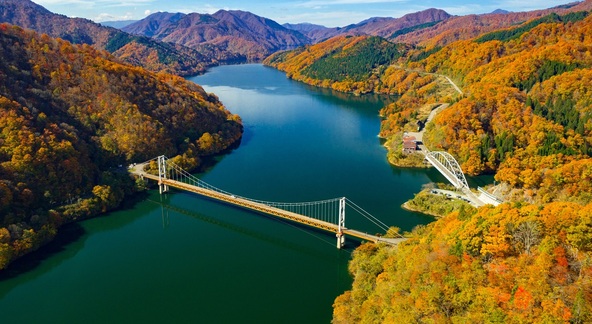 九頭竜湖では秋になると、周辺の山々が赤や黄色に色づき始めます。穏やかな湖面が鏡のように紅葉を映し出し、現実と反射が一体となった美しい光景が広がります。例年10月中旬から11月上旬にかけて、最も鮮やかな時期を迎えます。