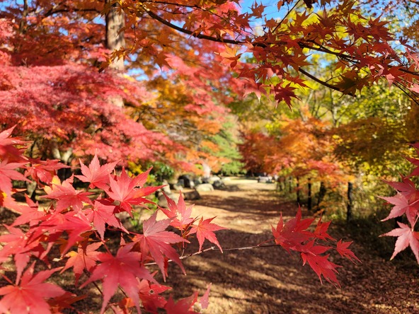 埼玉県嵐山町にある「嵐山渓谷」では、例年11月中旬から12月上旬にかけて紅葉の見頃を迎えます。渓谷周辺の燃えるような真っ赤なモミジや、黄色やオレンジのグラデーションの紅葉が楽しめます。また、槻川の川面に映る紅葉は、まさに秋の絶景です。