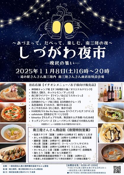 宮城県南三陸町の「道の駅さんさん南三陸」内にある南三陸さんさん商店街特設会場で、2025年11月8日(土)に「しづがわ夜市~晩秋の集い~」が開催されます。