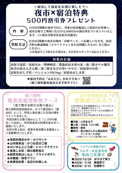 地元グルメの屋台や子ども向けの冒険ゲーム、宿泊者特典など、大人から子供まで楽しめる秋の夜のイベントです。