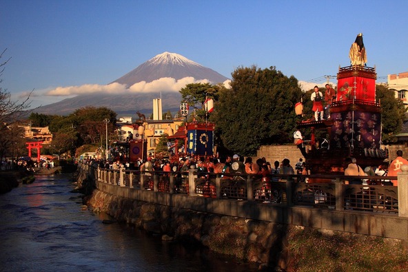 世界遺産「富士山」の構成資産である富士山本宮浅間大社において、毎年秋に開催される例大祭の附祭りが「富士宮まつり」です。20台の山車や屋台が集まり、勇ましい競り合いや華やかな共同踊りが披露されます。